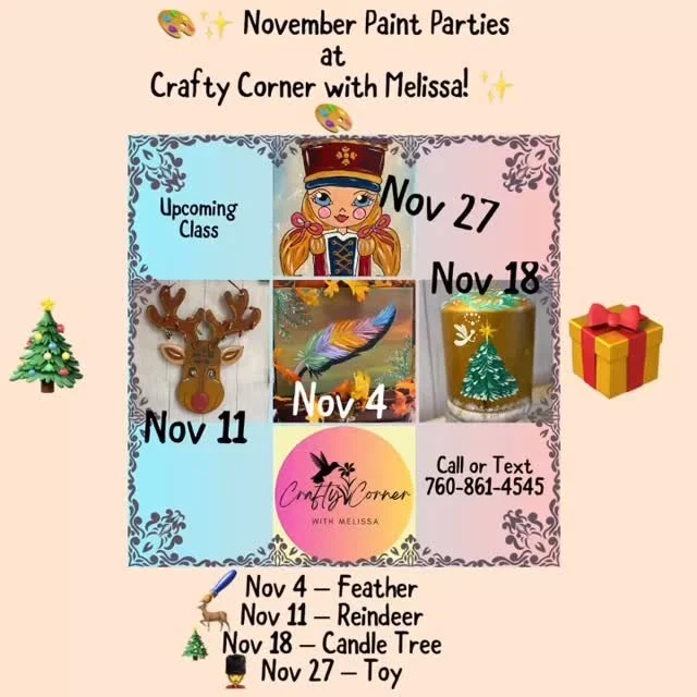 You can call or text Melissa at 760-861-4545 to book your next class! Just mention paint party and she will give you all the details!